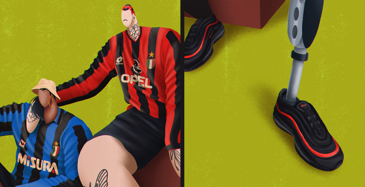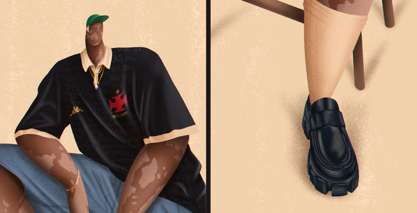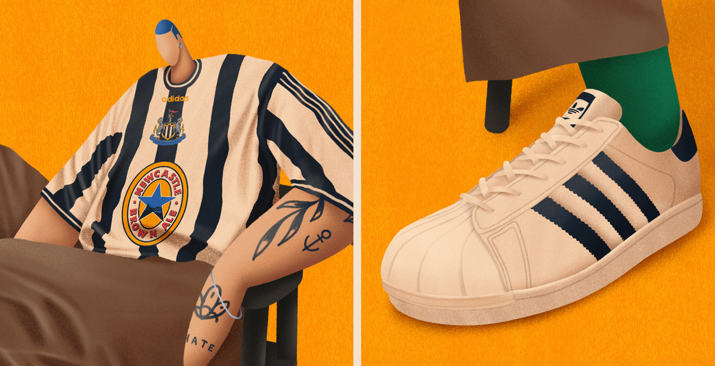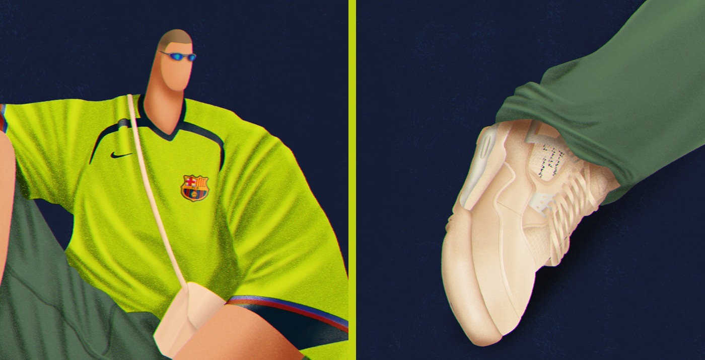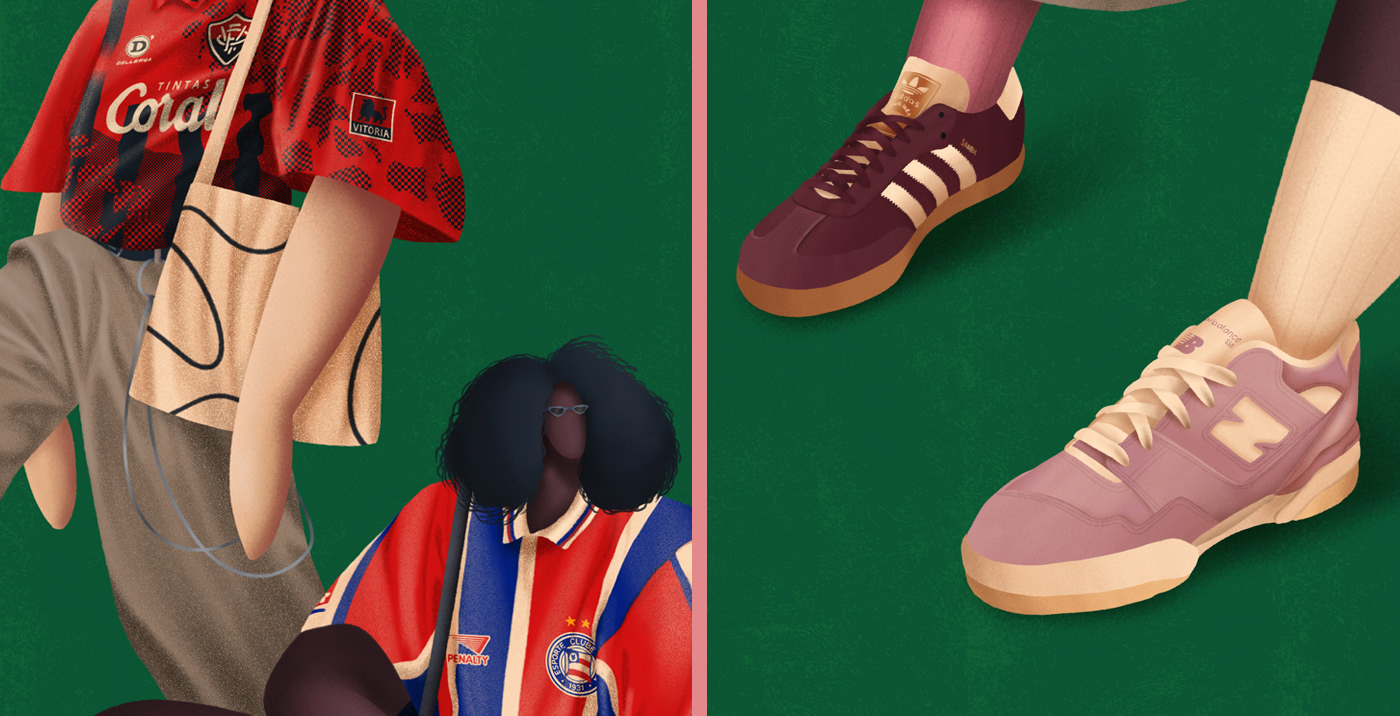 Series of illustrations inspired by Bloke Core, the fashion that combines football shirts with streetwear.